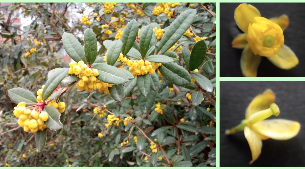Schon im März zeigen sich die wachsgelben, aber zu einem großen Teil noch geschlossenen Blüten, sie treten mit bis zu 15 an der Zahl in büschelartigen Dolden auf. Jede Blüte von Julianes Berberitze besitzt im Allgemeinen 6 Kelch- und 6 Kronblätter, wobei die Kronblätter an ihrer Basisinnenseite je zwei Nektarien besitzen; ferner entspringt ihnen dort je ein Staubblatt (= 6 Staubblätter). Der Griffel ist sehr kurz, fast nicht wahrnehmbar – mit anderen Worten: Die Narbe sitzt sozusagen auf dem oberständigen Fruchtknoten nahezu auf. Der Fruchtknoten selbst lässt schon die spätere Frucht erahnen.