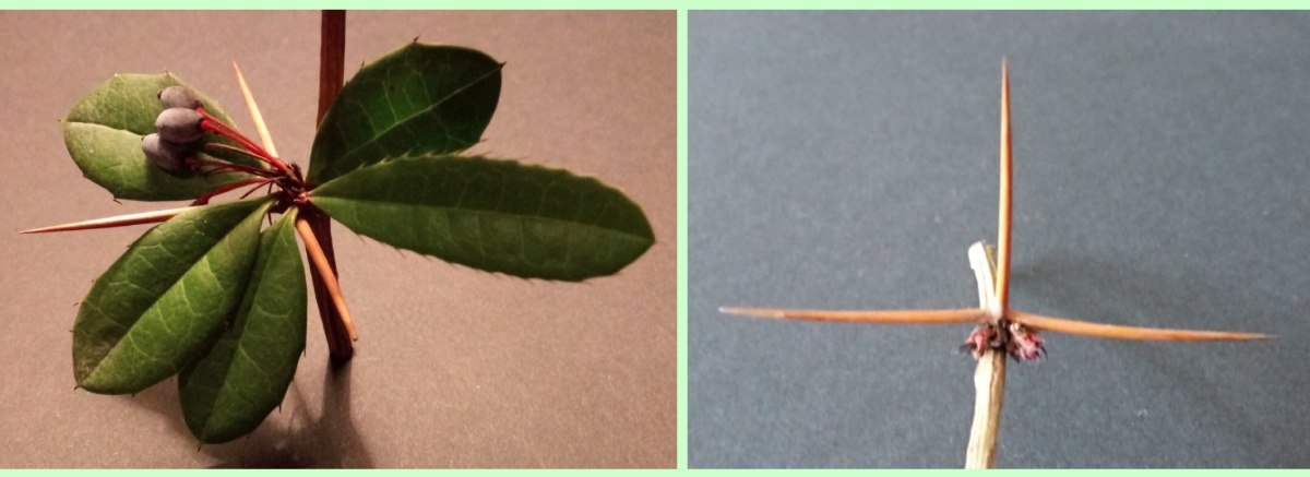 Markant sind die bis zu 4 cm langen (Blatt-)Dornen, die an den Langtrieben überwiegend im Trio auftreten und untereinander fast immer einen nahezu rechten Winkel bilden.