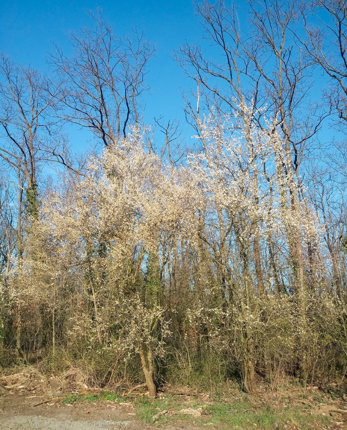 Gleichwohl die Kirsch-Pflaume etwa 14 Tage früher mit ihrer Blüte aufwartet als die Schlehe (Prunus spinosa), kommt es zu zeitlichen Überschneidungen und es ist ratsam, genauer hinzuschauen, um eine Verwechslung zwischen beiden Prunus-Arten, nur ihrer Blüte nach, auszuschließen.