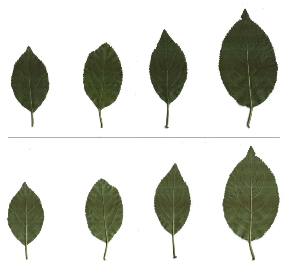 Die wechselständig angeordneten und ihrer Form nach mehr oder weniger elliptisch ausfallenden Blätter können bis zu 9 cm lang und 4,5 cm breit sein; hierbei beträgt die Länge des Blattstiels 1 bis ca. 1,5 cm. Das Spreitenende ist spitz bis zugespitzt, die Basis (breit) keilförmig oder abgerundet. Der Blattrand ist durchgehend fein gesägt. Unterseits ist die Hauptader fein behaart und auch der Blattstiel weist oftmals noch eine sehr spärliche Behaarung auf.