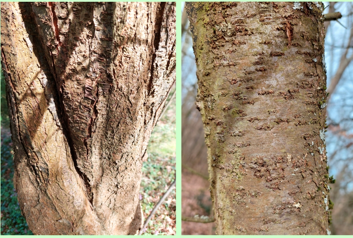 Die Borke jüngerer Kirsch-Pflaumen ist mit auffällig vielen Lentizellen versehen. Im unteren Bereich, zum Boden hin bzw. erst im Alter, wird die Borke graufarben rissig.