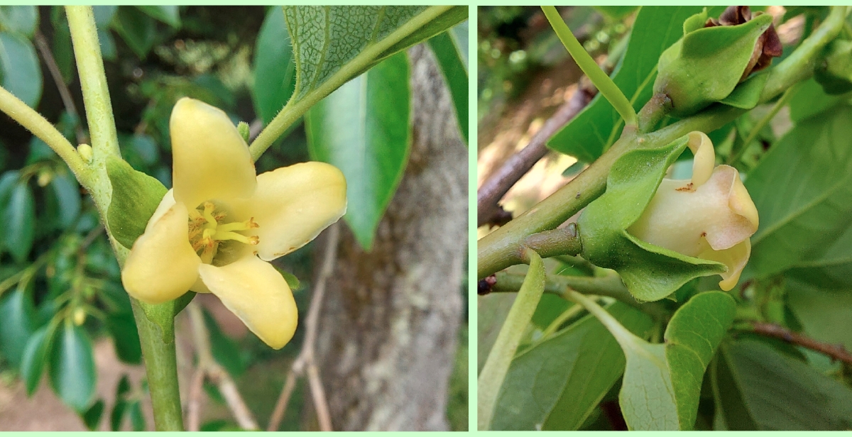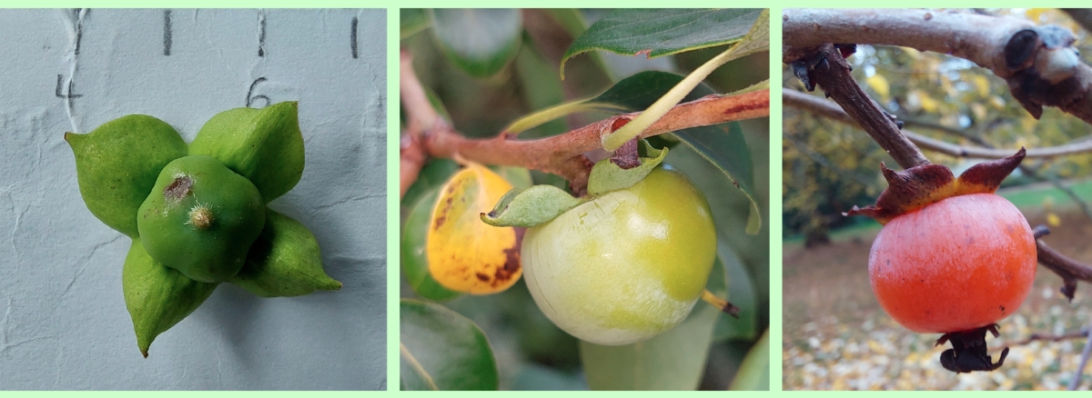 Die Blüte der Persimone setzt etwa im Juni ein. Es sind die Blüten überwiegend zweihäusig verteilt. Den männlichen wie den weiblichen Blüten sind ihre vier cremeweiß-farbenen, zurückgeschlagenen Kronblätter gemein. Während in den Blattachseln diesjähriger Triebe die weiblichen Blüten stets einzeln auftreten, ist die Anzahl männlicher Blüten an gleicher Stelle, z. T. büschelartig, mit ± 3 höher. Ein Blick in die weibliche Blüte lässt unmittelbar die im Allgemeinen 4 existierenden Griffel bzw. bei den männlichen Blüten deren 16 Staubblätter erkennen.