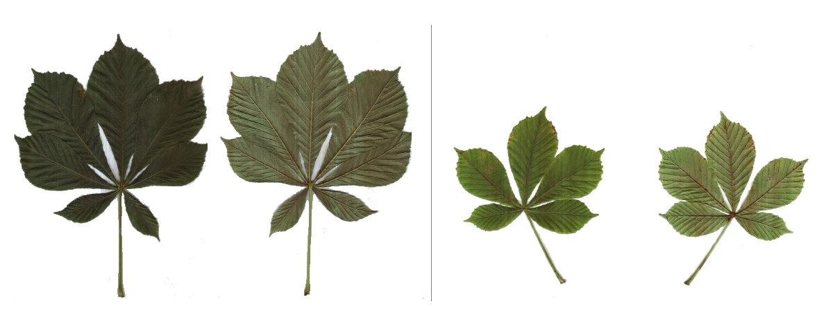 Die Form und Größe der Baumanii-Blätter weicht nur ganz geringfügig von der ursprünglichen Gemeinen Rosskastanie ab. Das fingerförmig zusammengesetzte Blatt ist 5-7 lappig und die Blättchen sind im oberen Bereich unregelmäßig, stellenweise doppelt gesägt mit – in Abgrenzung zur Gemeinen Rosskastanie – offensichtlich geringfügig kleineren Zähnen. An der Spitze sind die 5-16 cm langen Blättchen größtenteils deutlich zugespitzt. Die größte Breite der mit einer keilförmigen Basis versehenen Blättchen liegt überwiegend im oberen Drittel, womit ein verkehrt-eiförmiger Umriss gegeben ist. Stellenweise sind die Blättchen auch elliptisch. Die Blattunterseite ist sichtbar heller als die Oberseite.