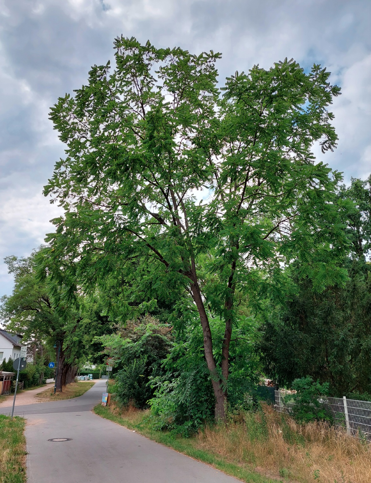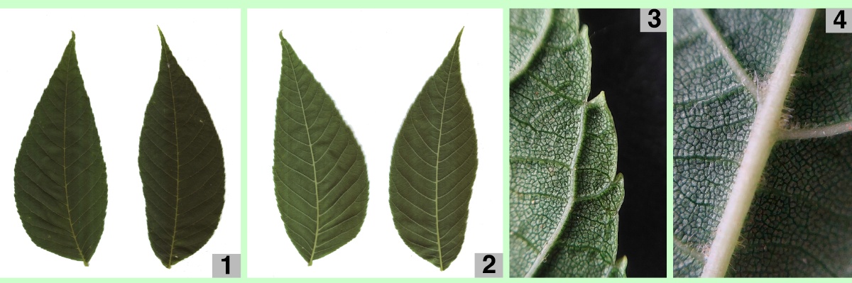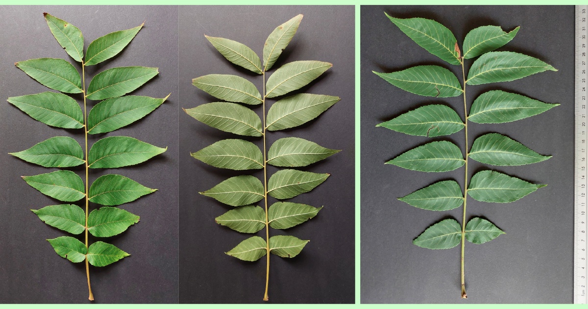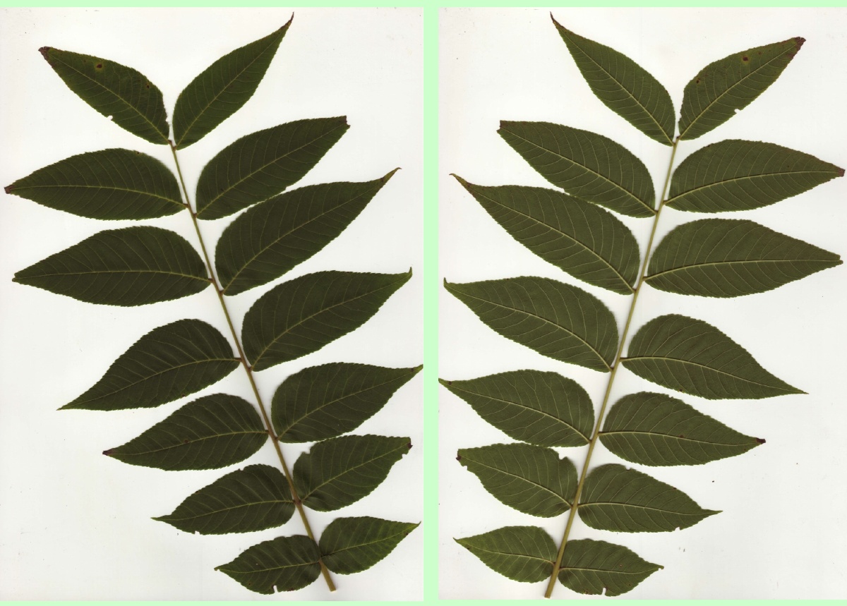 Am Rand sind die zwischen 6-15 cm langen Blättchen auf etwa 4/5 der Spreite nach oben hin gesägt. Um das Ende des unteren Spreiten-Drittel herum ist ein Blättchen mit ca. 3-3,5 cm am breitesten. Die länglich-eiförmigen Blättchen sind zugespitzt und an ihrer Basis abgerundet, gelegentlich auch schwach schiefförmig. Unterseits ist die deutlich hervortretende Mittelader mit einer leicht abstehenden Behaarung versehen. Die Blattoberseite ist kahl, dunkelgrün und die Adern erscheinen geringfügig eingedrückt. Je Blättchen sind hälftig bis zu ca. 18 Seitenadern zu beobachten, die im Allgemeinen nicht durchgehend zum Blattrand reichen. Der bis zu 6 cm lange Blattspindetteil, gemessen ab Blattgrund bis zum ersten Blättchenabzweig, ist kahl.