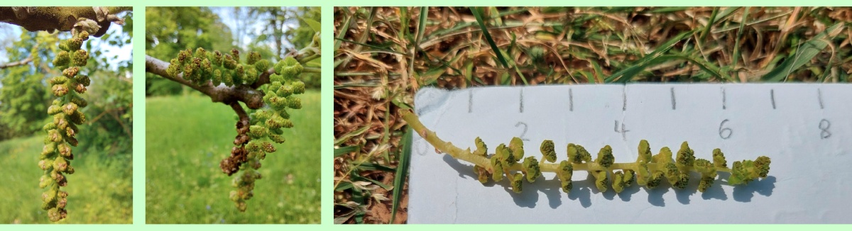 Die eingeschlechtlichen Blüten sind einhäusig verteilt. Es befinden sich die männlichen Blüten auf bis zu 12 cm langen hängenden Kätzchen vorjähriger Zweige. Die weiblichen Blüten, aufrecht stehend, sind grün-weisslich kugelig, treten an einer Stelle zu 2-5 auf und haben deutlich sichtbar federige Narben.